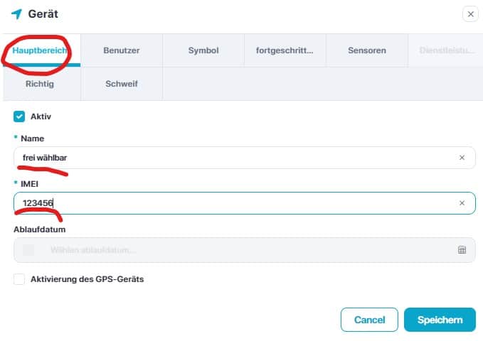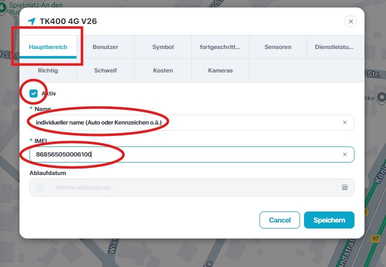 Ein neues Menü wird angezeigt in dem Sie aufgefordert werden den Namen und die IMEI einzugeben. Den Namen des Objektes können Sie frei vergeben z.B.: das Autokennzeichen oder den Fahrzeugtyp. Die IMEI des Geräts finden Sie auf einem Aufkleber am Gerät oder auf der Verpackung. Bitte nur die Zahlenreihe eintragen und keine Buchstabenkennung (E). Auf einigen Trackern wird die ID abgebildet. Dann tragen Sie bitte die ID ein.