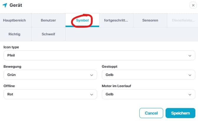 Den Haken bei „Aktivierung des GPS-Geräts“ müssen Sie nicht setzen. Die Plattform liest die Discription des Trackers automatisch aus. Diese Aktivierung ist nur für das Orten von Smartphones oder Tablets nötig. Nun gehen Sie auf den Reiter „Symbol“. Dort wählen Sie einfach eine Farbe und einen Icon aus, wie der Tracker künftig in der Plattform dargestellt werden soll.