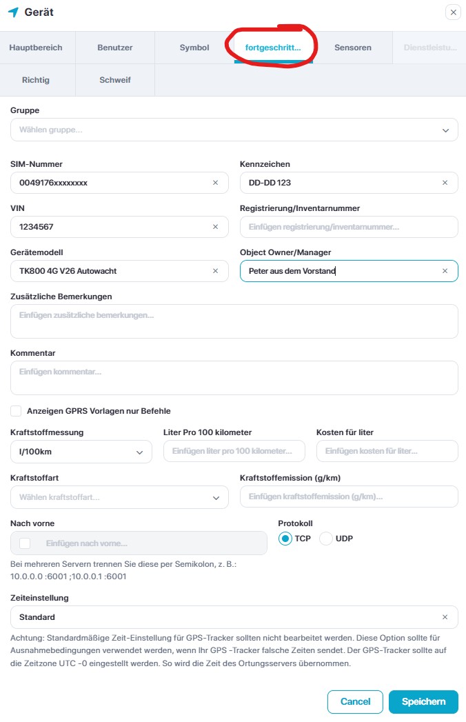 Gehen Sie weiter auf den Reiter „fortgeschritten“. Hier tragen Sie die Telefonnummer der SIM-Karte des Trackers ein, das Kennzeichen Ihres Fahrzeuges oder alle anderen individuellen Informationen, die Sie für Ihre Unternehmungen brauchen. Diese hier getätigten Einträge sind ausschließlich für Ihre Organisation.