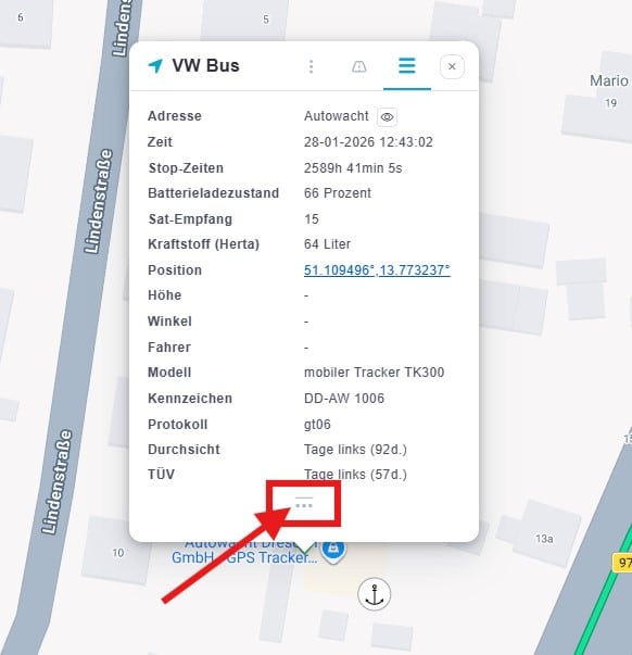 In dem minimierten Popup-Fenster über dem Icon des Trackers auf der Karte, können Sie grundlegende Geräteinformationen und wichtige Sensordaten auf einen Blick einsehen.
