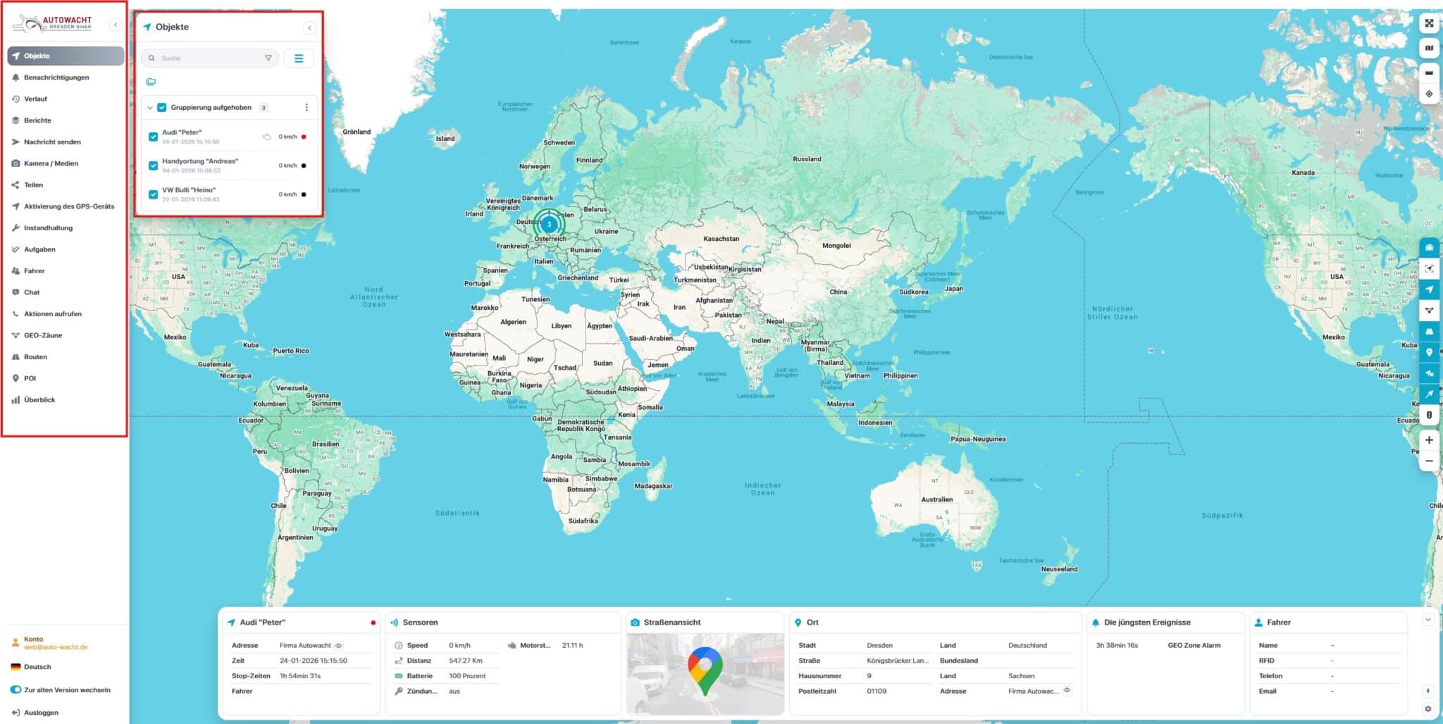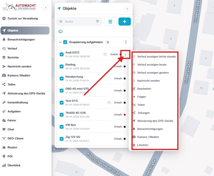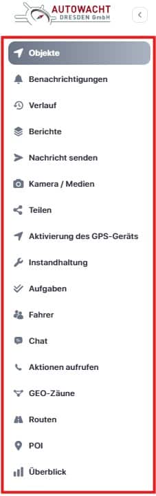 Nach dem Login öffnet sich eine zentrale Kartenansicht mit integrierter Steuerung sowie ein Seitenpanel, das alle verfügbaren Funktionen bündelt.