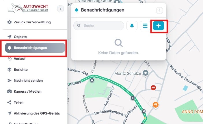 Benachrichtigungen – Hier können die gewünschten Alarmierungen für das ausgewählte Fahrzeug eingetragen werden – Schnellzugriff.