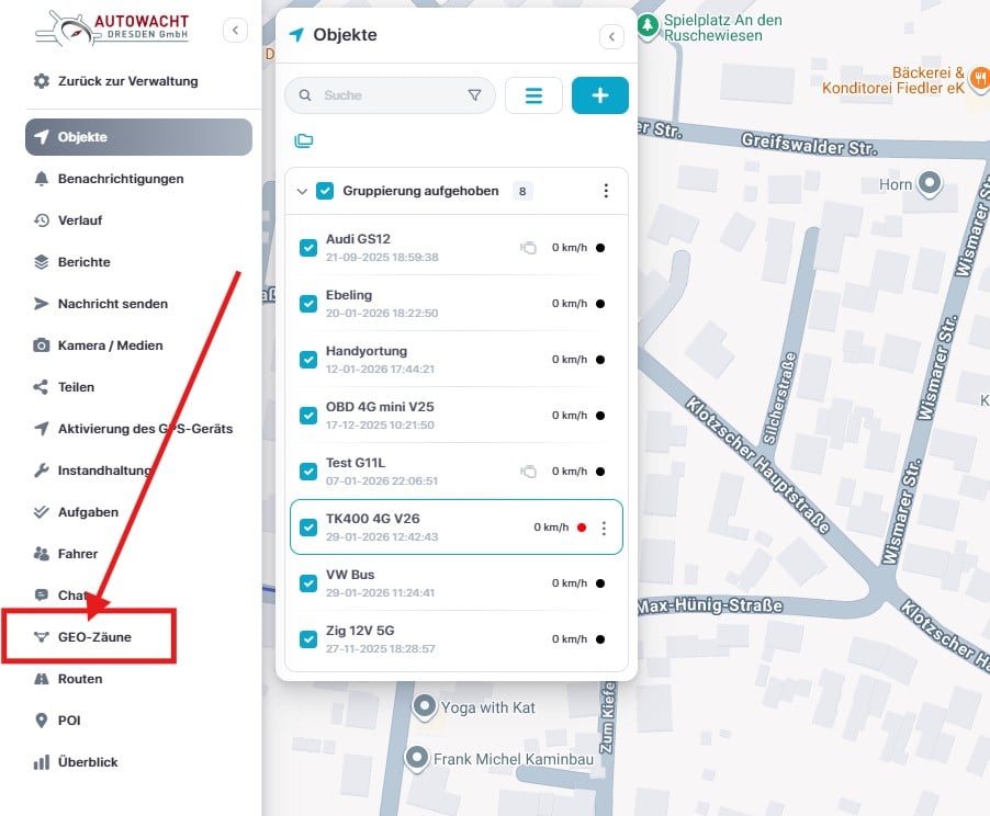 Um eine GEO-Zone zu erstellen, klicken Sie links in dem Paneel auf den Icon „GEO-Zäune“.