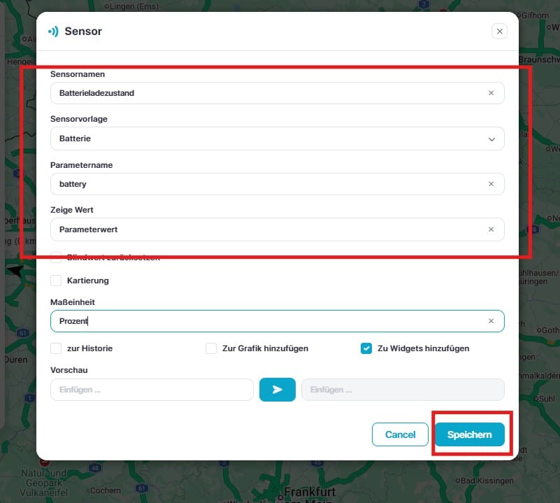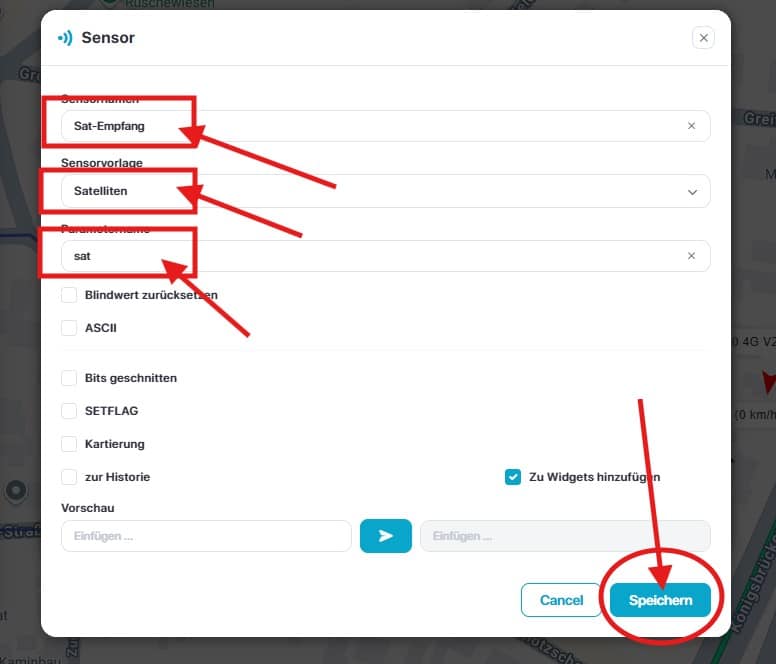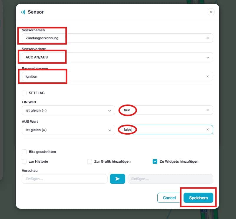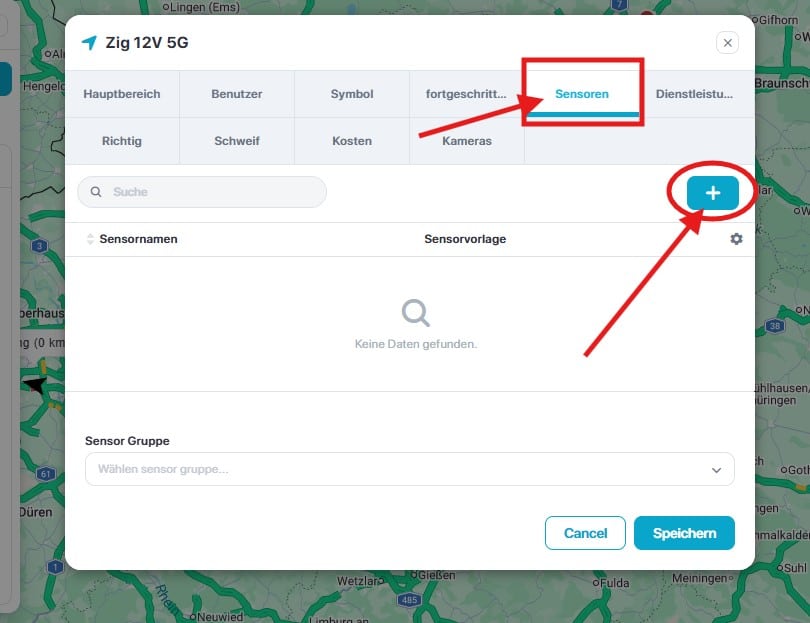 Um einen Sensor hinzuzufügen, z.B. Motor an/aus, Acc an/aus, Batterie, Kraftstofftank, Kilometerzähler, Temperatur, Tür öffnen/schließen, GSM-Signal, GPS-Signal, Satellitensysteme, Drehzahlzähler usw., muss bewertet werden, ob der eingebundene Tracker die gewünschten Datensätze auch überträgt. Dazu schauen Sie bitte in die Deskription des Trackers bzw. erfragen Sie diese bei Ihrem Hardwarehändler.