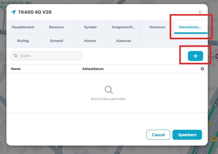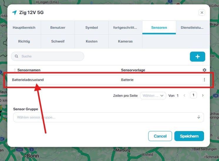 Viele Tracker übertragen in Ihren Datensätzen den Ladezustand des eingebauten AKKUs. Diesen können Sie in der Ortungsplattfom/APP abbilden. Dazu klicken Sie im Fenster auf „Sensoren“ und dann auf das „+“.