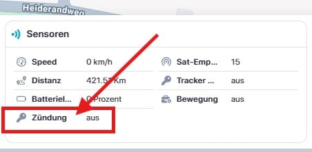 Der Sensor Zündungserkennung zeigt an, ob die Zündung eingeschaltet ist. Dazu muss bei den Einbautrackern das orange Kabel (Zündungsplus) mit angeschlossen werden. Bei den OBD-Geräten erfolgt das automatisch.