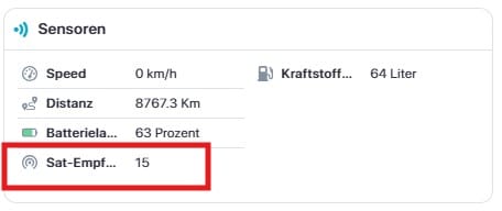 Um die Signalgüte auszulesen und zu verstehen warum der Standort ab und an um einige Meter abweicht, ist die Abbildung des Satellitenempfangs vorteilhaft. Je weniger der Tracker Satelliten einfängt, desto ungenauer ist die Standortabbildung. Der Tracker sollte mindestens 7 Satelliten empfangen können.