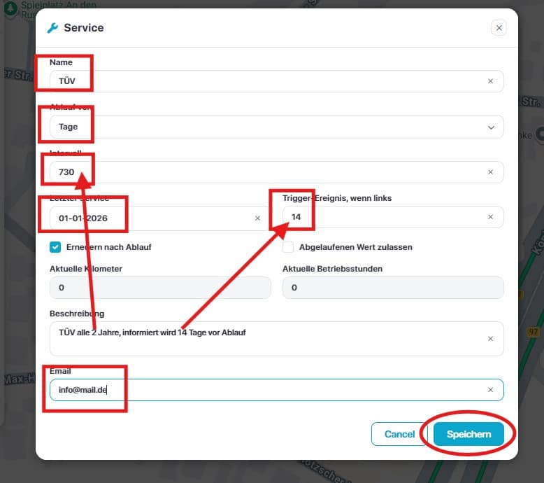 Hier am Beispiel TÜV alle 2 Jahre abgebildet. Die Info erfolgt 14 Tage vor Ablauf an die eingetragenen Mailadressen.