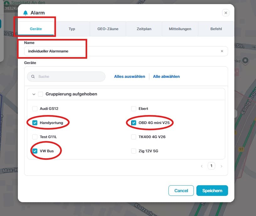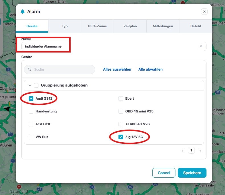 Wählen Sie wieder einen individuellen Namen für den Alarm. Klicken Sie die Fahrzeuge an, für die der Alarm gelten soll.
