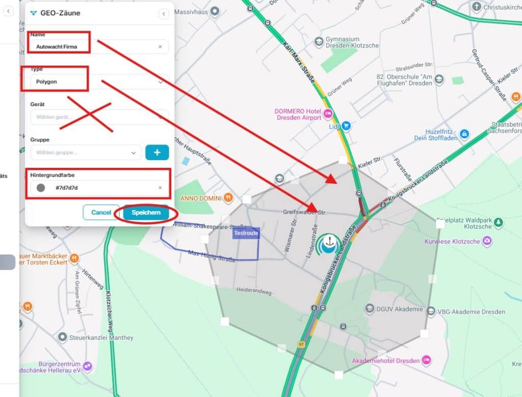 Klicken Sie das „+“ an, geben Sie einen individuellen Namen ein, wählen Sie den GEO-Zaun Typ und entscheiden sich für eine Farbe. Dann wechseln Sie mit dem Curser auf die Karte und beginnen Ihren GEO-Zaun zu zeichnen. ACHTUNG! Das Feld „Geräte“ muss leer bleiben! KEINEN Tracker auswählen, sonst wandert der GEO-Zaun mit.