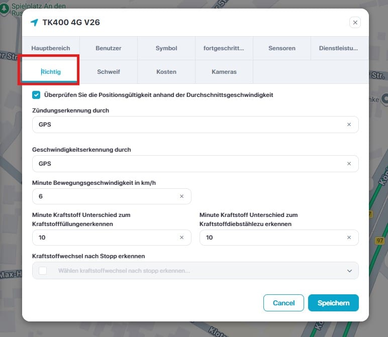 Bei Einbautrackern mit Anschluss der Zündungserkennung und OBD-Steckern, sollte immer der Sensor: ACC ausgewählt werden! Das macht die Berichtsauswertung in den Fahrtenblättern genauer. Mobile Tracker oder Tracker ohne Sensoren setzen hier das Protokoll: GPS
