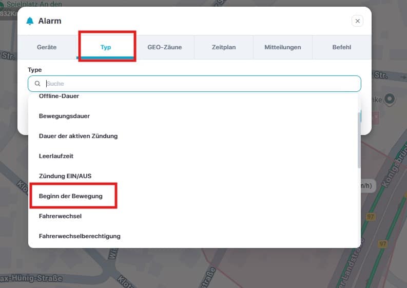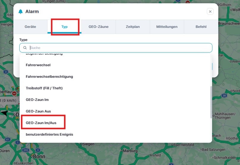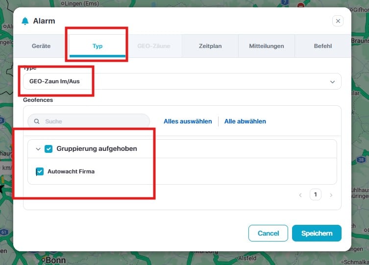 Gehen Sie in der Leiste weiter auf Type und wählen dort diesmal den Alarm-Typ „GEO-Zaun Im/Aus“ und markieren Sie den GEO-Zaun der aktiv geschaltet werden soll.