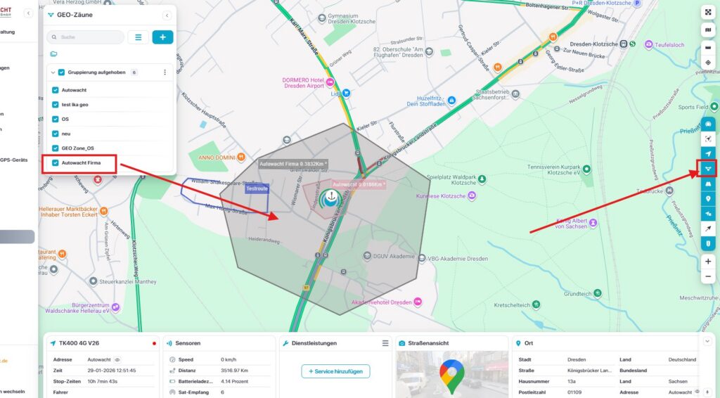 Zum ein- und ausblenden des GEO-Zaunes nutzen Sie die Statusleise auf der rechten Seite.