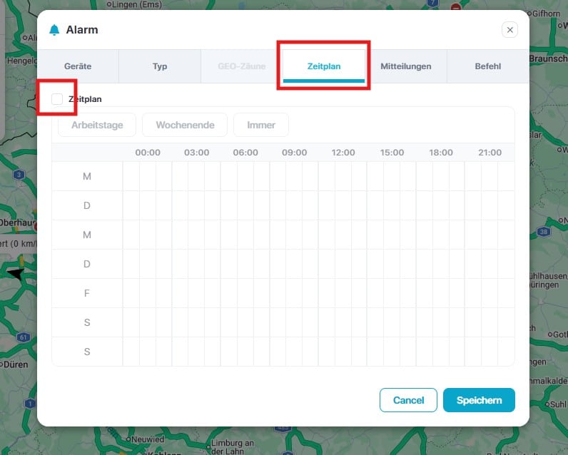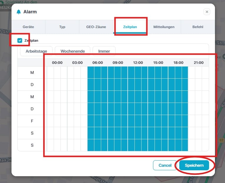 Wählen Sie einen Zeitplan aus, also wann soll der Alarm aktiv und inaktiv sein. Alle in der Farbe Blau markierten Kästchen, bedeuten, dass der Alarm aktiv ist. Wenn Sie den Haken bei „Zeitplan“ entfernen, gilt der Alarm 24 Stunden.