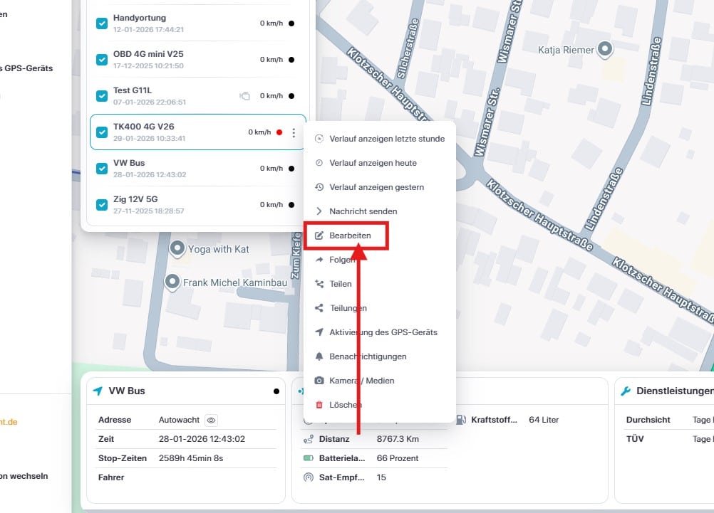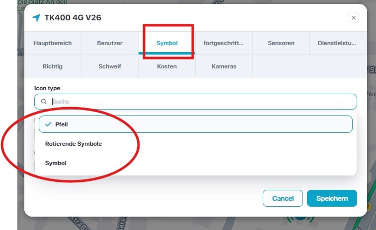 Bearbeiten – Hier geben Sie die für Sie wichtigen Infos zur Darstellung der Tracker z.B.: IMEI, Ortungsgenauigkeit, Symbole und vieles mehr ein.