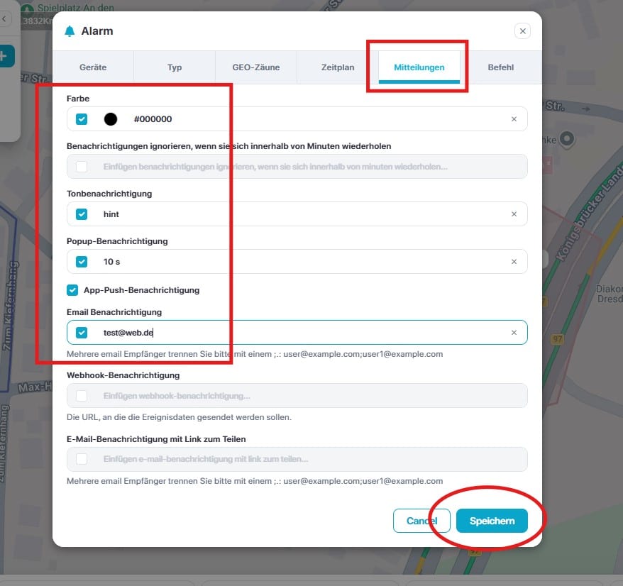 Unter dem Button Mitteilungen legen Sie fest, wie Sie alarmiert werden wollen. Klicken Sie im Anschluss auf „Speichern“. Die Ortungsplattform/ APP alarmiert nun per Pusch und Mail, sobald sich der Tracker bewegt.