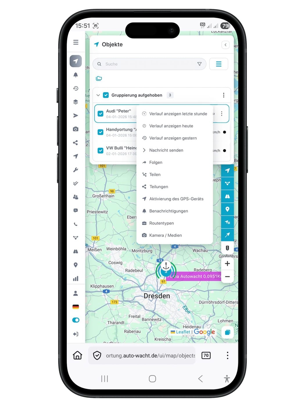 Der Standort wird Ihnen per SMS übermittelt und ist gleichzeitig in der Ortungsplattform und App sichtbar.